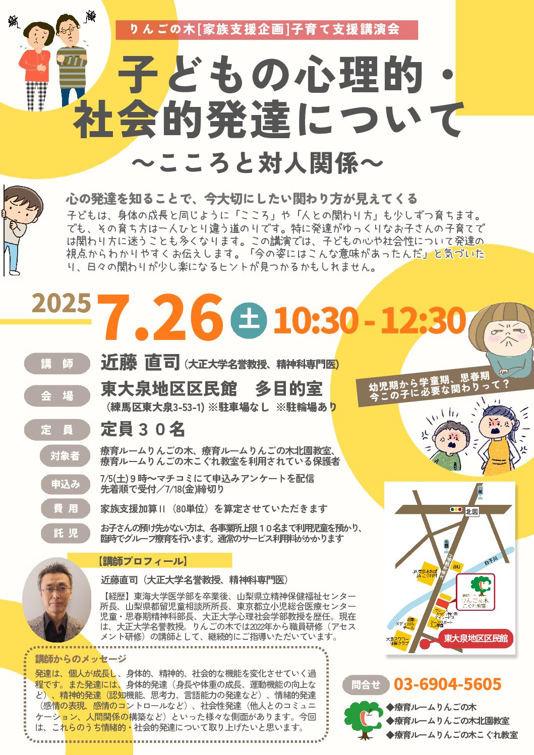 お知らせ りんごの木【家族支援企画】子育て支援講演会を開催します 2025年7月26日(土)に保護者の方に向けた子育て支援講演会を開催します。 今年度は、大正大学名誉教授・精神科専門医の近藤直司先生にお越しいただき「子どもの心理的・社会的発達について ~こころと対人関係~」というテーマでお話いただきます。... 2025.06.26 お知らせ